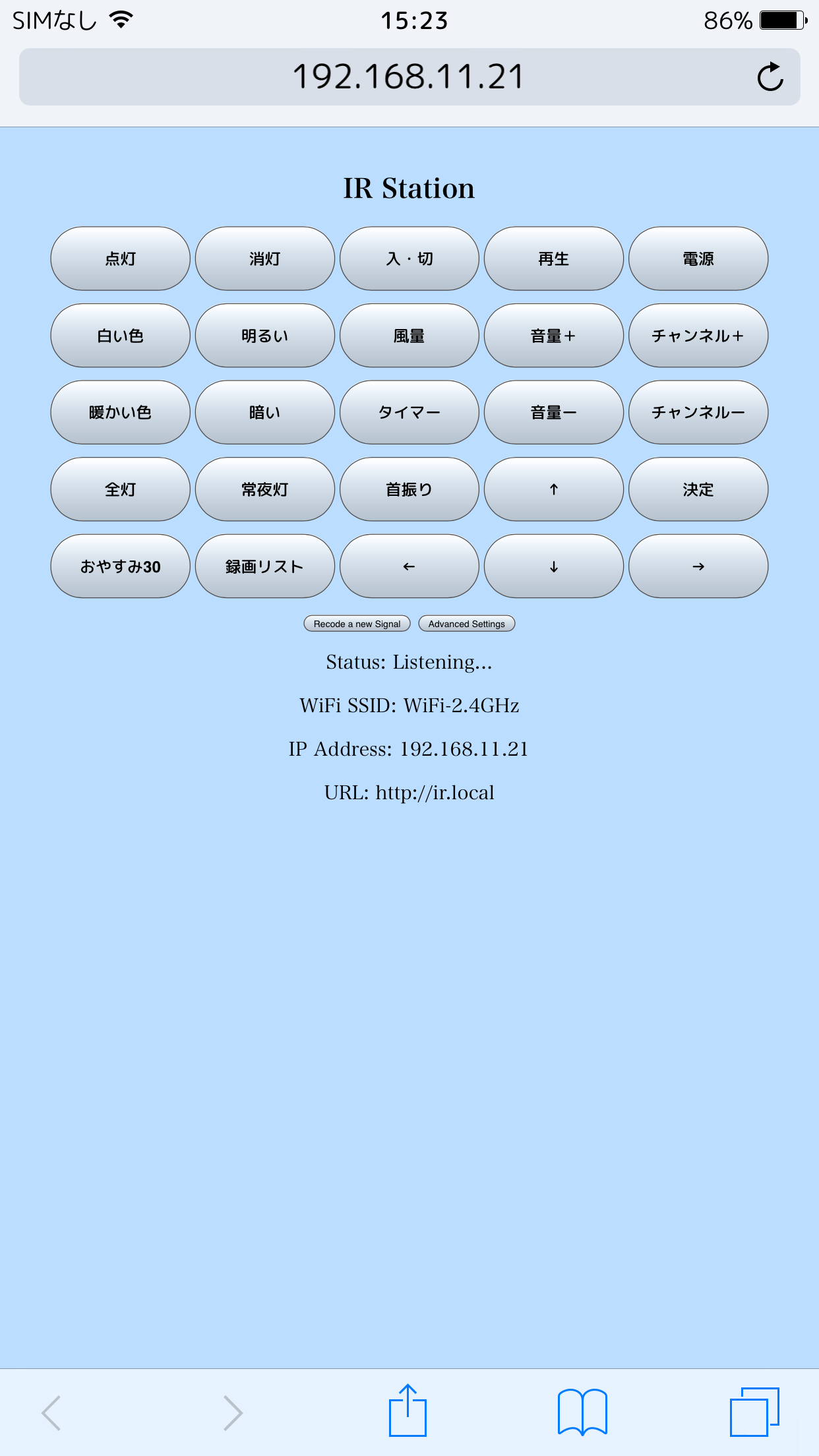 画面上のボタンを押すだけです。そのボタンに割り当てられた赤外線信号がIR-Stationから送られます。送信中は画面のボタンがピンクに変わります。ピンク色が元の白色に戻ったら送信完了です。