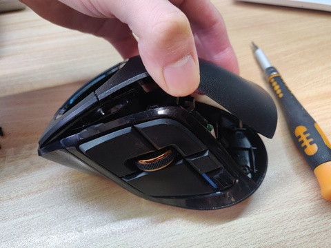マウスの先頭部分にはプラチックの差し込みがあるので後方から慎重に分解します。